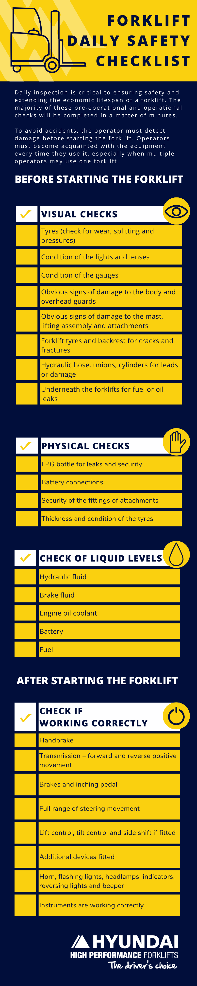 - Always perform a daily safety checkA forklift operator is required by law to conduct a safety check on each forklift that he operates for the first time each day or shift. The employer must record and retain that safety check in an audit or incident. Some safety checks, such as lights, seat belts, and chains, are performed post-operatively, that is, while the forklift is not in use. Others, such as brakes and hydraulics, are completed while the forklift is in operation. Each company will have different policies in this regard, but each forklift must have at least one safety check per shift. Use our helpful checklist above if you need one.